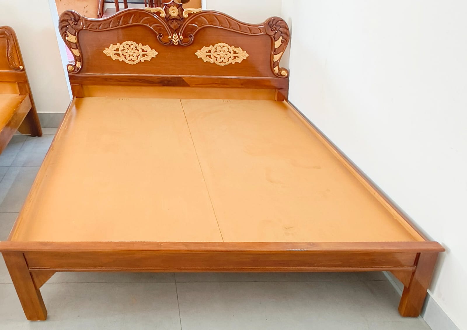 Headboard: The headboard is ornate and features intricate carved details. It includes decorative floral patterns, likely made from a different color or inlay material to add contrast. The curved and carved top gives it a royal or antique look. Material: The cot appears to be made of solid wood, likely teak or another hardwood, known for durability. The surface is polished, giving it a glossy finish.